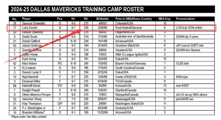 从名单中可以看到,东契奇体重为244磅(110kg)。而值得一提的是,上赛季东契奇开赛时的体重为230磅(104kg)。